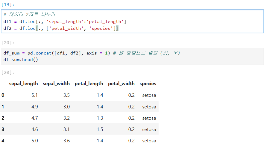 여러 개로 나누어진 데이터를 행(Row)이나 열(Column) 방향으로 합칠 때는 pd.concat을 사용합니다.