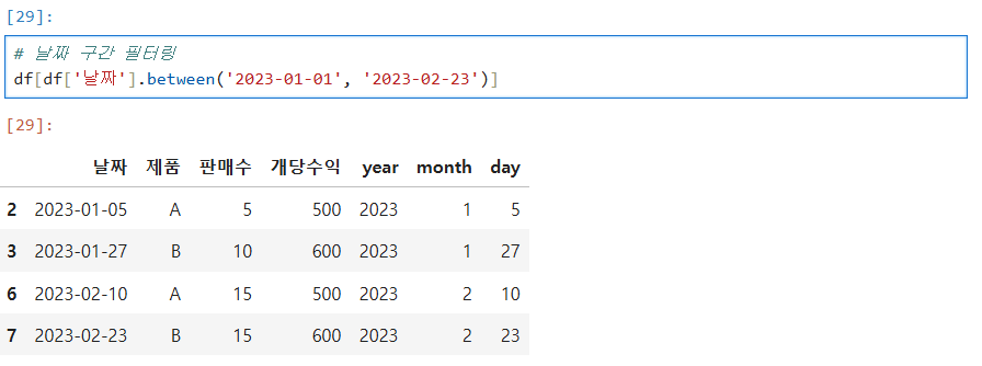 result = df[df['날짜'].between('2023-01-01', '2023-02-23')]